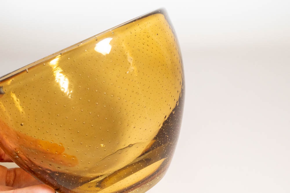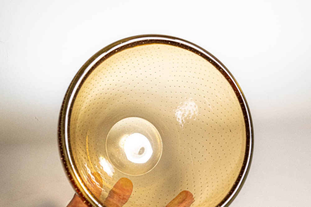 Nuutajärvi/ヌータヤルヴィ社よりビンテージボウルが入荷いたしました。美しく並ぶ気泡が特徴的なシリーズを手掛けたのはGunnel Nyman/グンネル・ニューマンです。有機的なフォルムを得意とし、ガラス作品で名作を生み出しました。ガラスの内部に細かな気泡が並ぶこのシリーズは彼女の代表作のひとつであり、様々なアイテムに展開されています。こちらの薄いブラウンカラーは市場でもあまりみかけない珍しいものです。