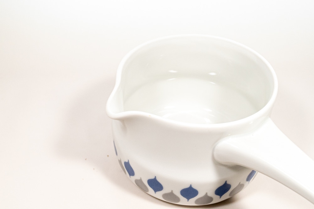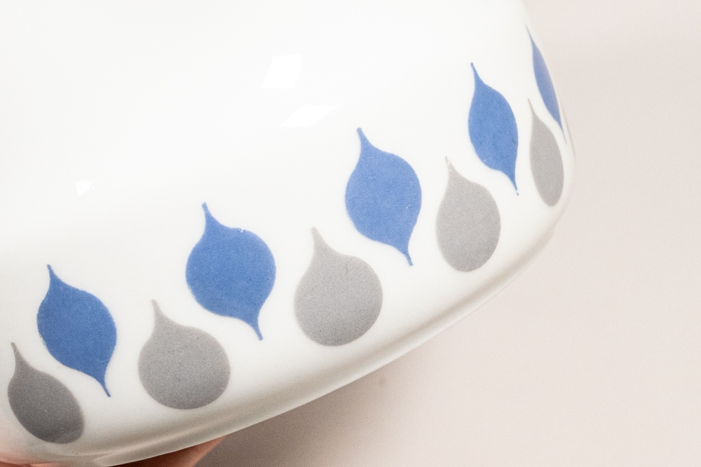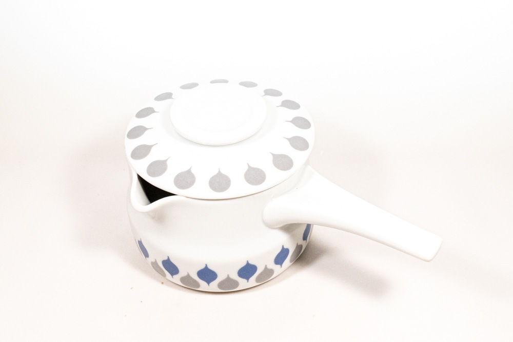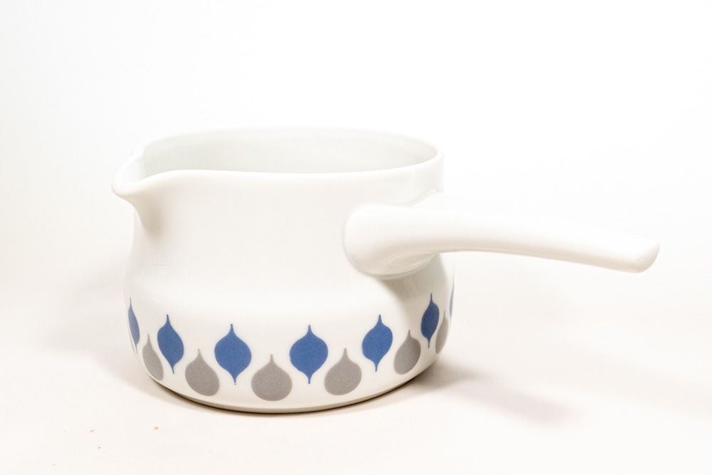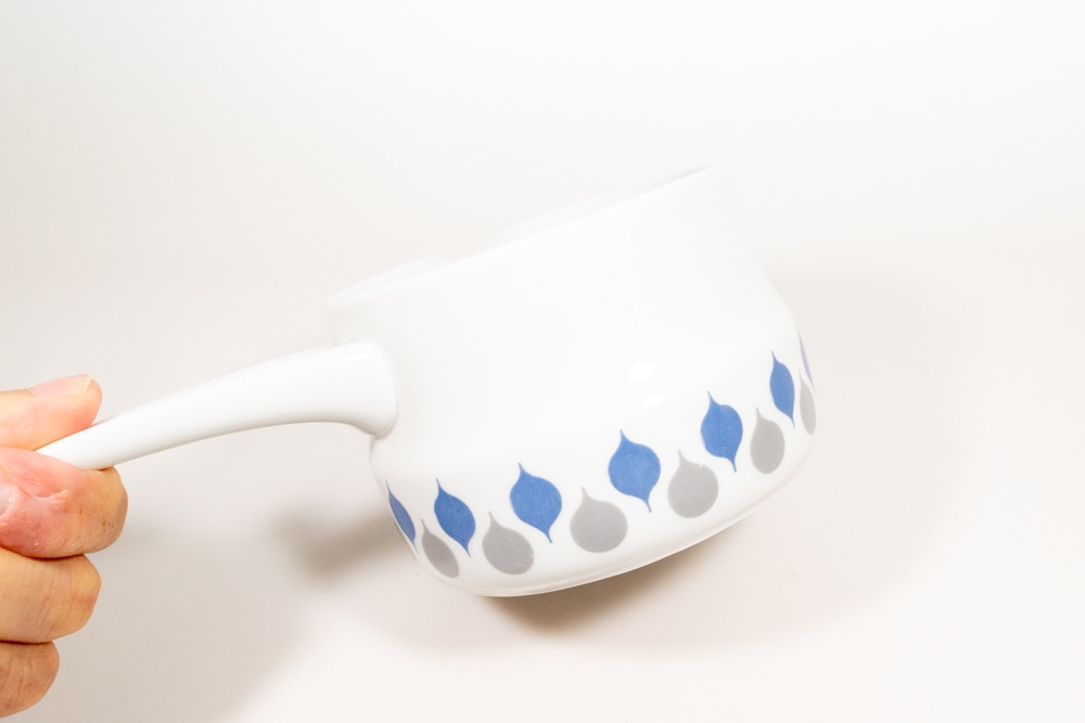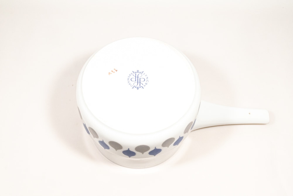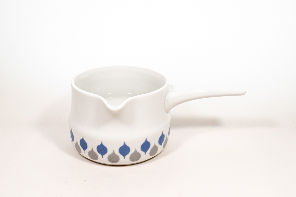 LYNGDY PORCELIN/リュンビューポーセリン社よりDanild 66シリーズのソースパンが入荷いたしました。1936年に創業したデンマークの磁器メーカーで、一度工場は閉鎖されましたが、2012年に生産を再開しています。1950年代に直火、オーブン使用可能なDan-ildシリーズを生産し大ヒットとなりました。くすみカラーののグレーとブルーのドロップ型の模様が交互に並んでいてとても可愛いです。わずかなプリントロスなどは確認できますが、極端なものではないと思います。