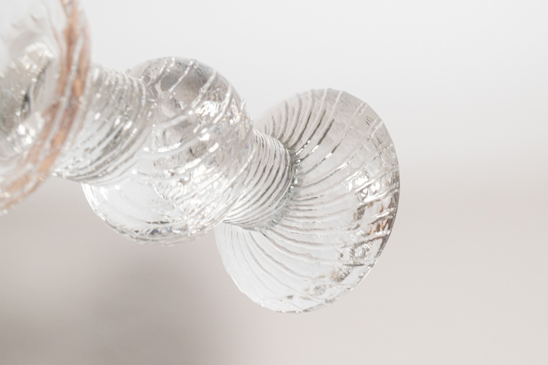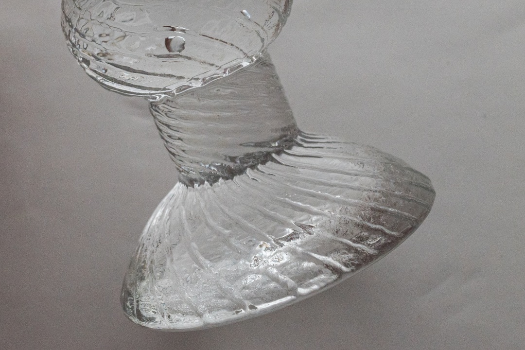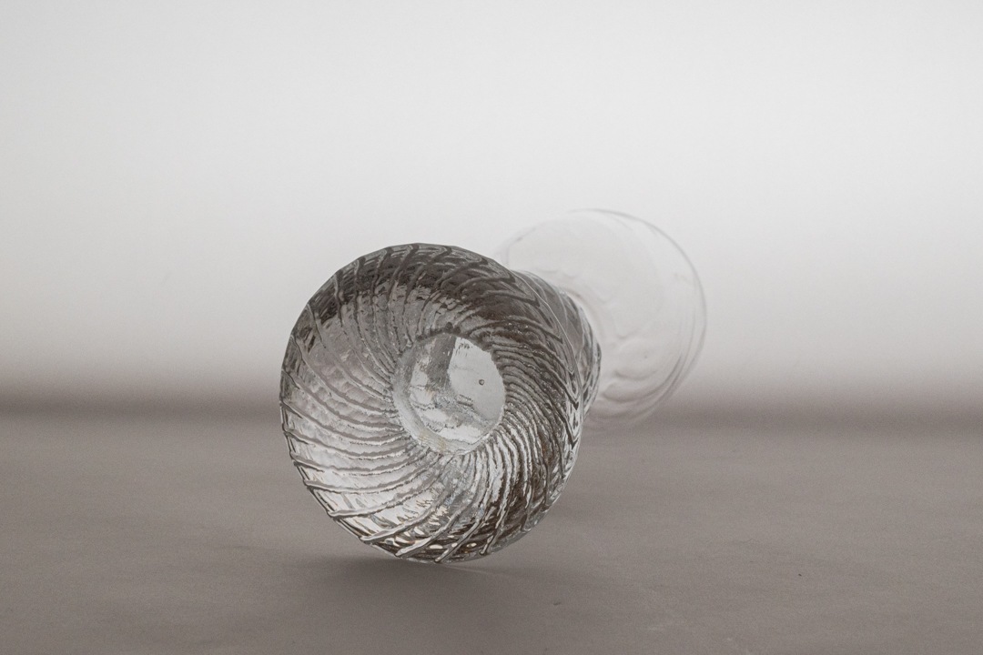 「Ritari(リタリ)」と名付けられたこちらのグラスは、フィンランド語で「騎士」を意味します。グラス部分には揺らぎ加工、ステムやプレート部分には斜めに流れるようなエンボス加工が施され、小ぶりながらも美しいたたずまいです。