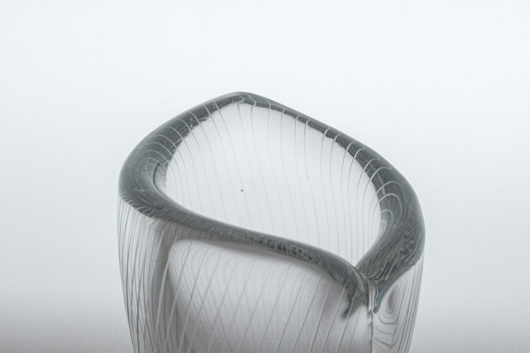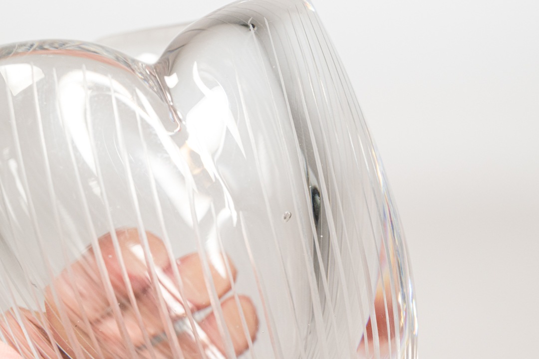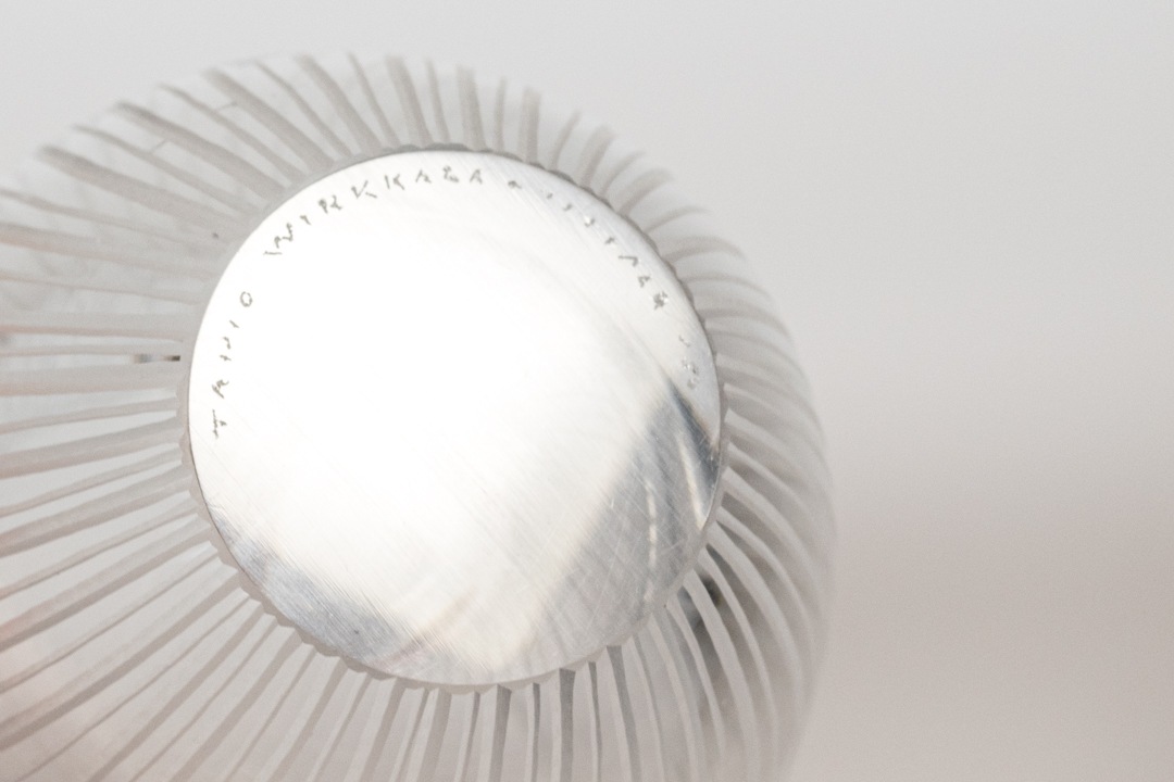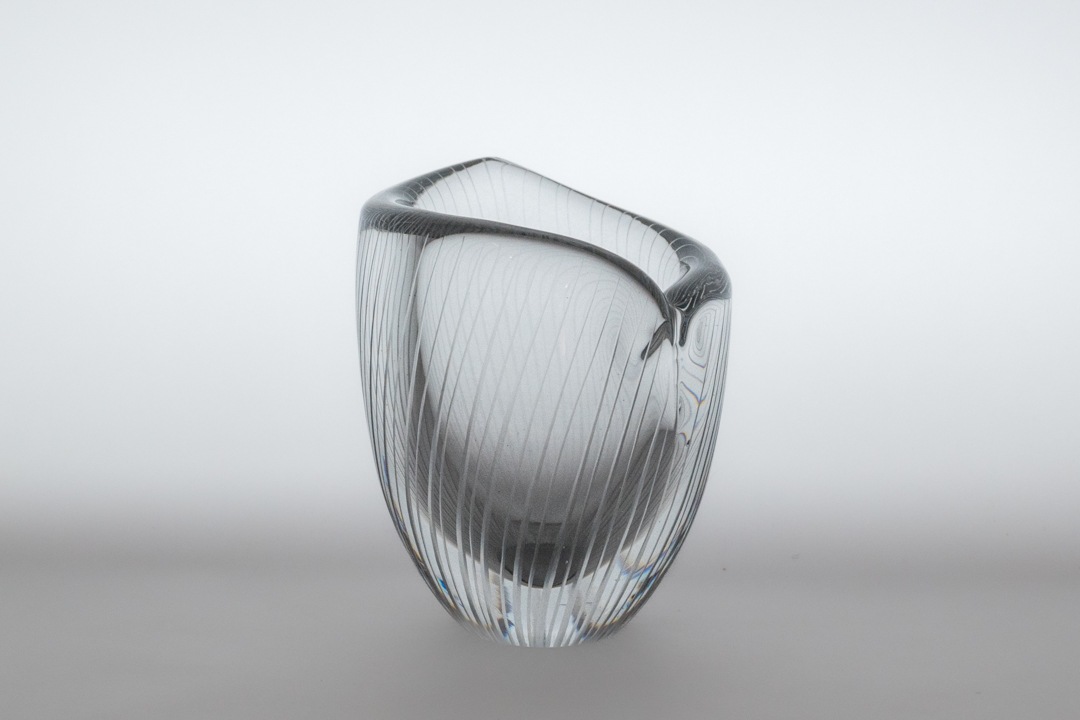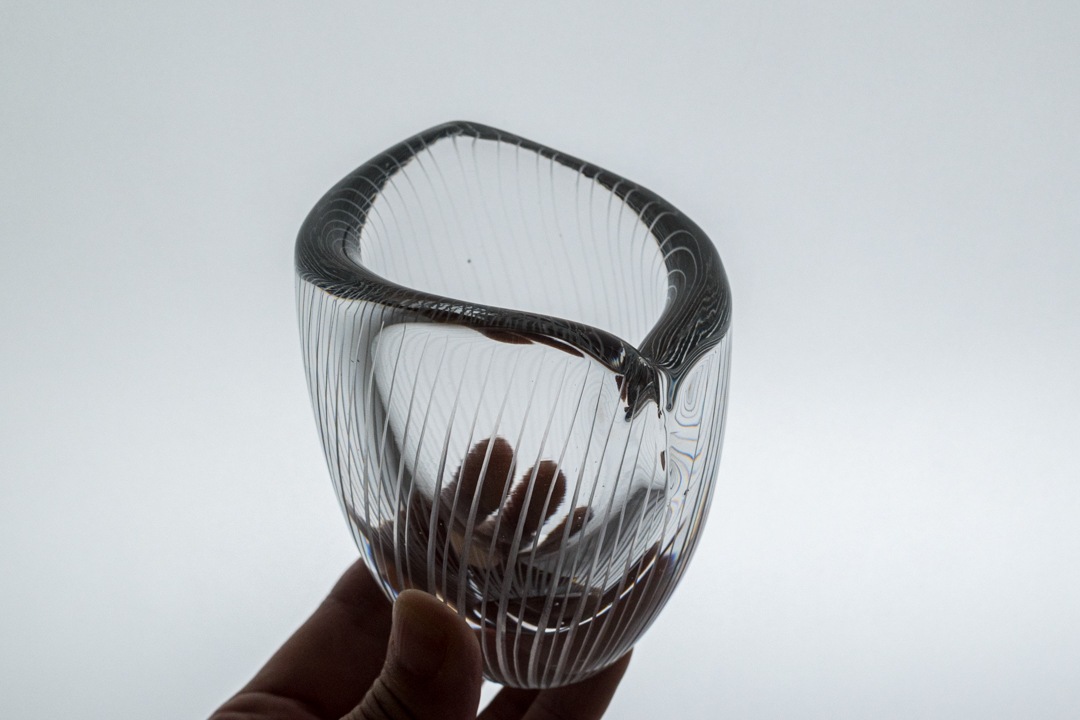 iitala/イッタラ社よりヴィンテージのベースが入荷いたしました。デザイナーであるTapio Wirkkala/タピオ・ウィルッカラはイッタラ社でのガラス作品をはじめ、幅広い分野で活躍したフィンランドを代表するデザイナーの一人です。自然からインスピレーションを受けたデザインを中心に、多くの名作を生み出しました。1950年代に発表されたこちらのシリーズは名作として知られ、クリスタルガラスに施されたラインカットと手に馴染む美しい流線型のフォルムが特徴です。ガラスの中に光を取り込み、角度によって表情を変える姿はとても美しく、小ぶりながらも存在感があります。底面には「TAPIO WIRKKALA IITTALA 56」のカットさんも確認できます。