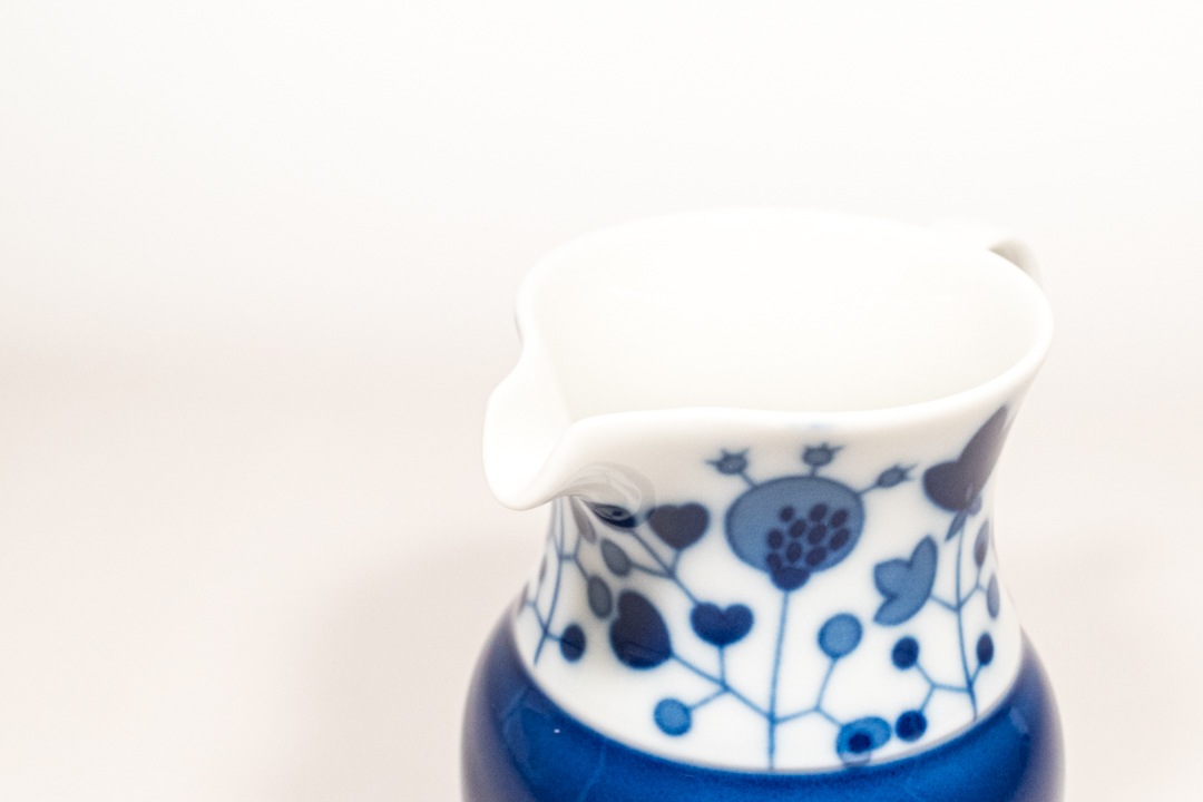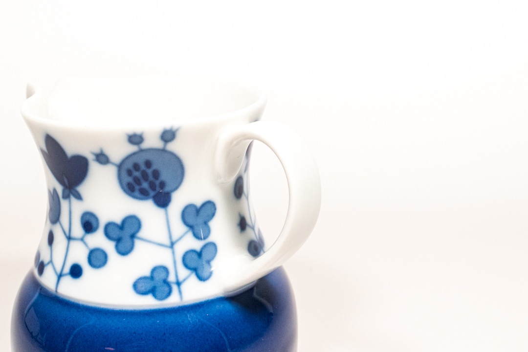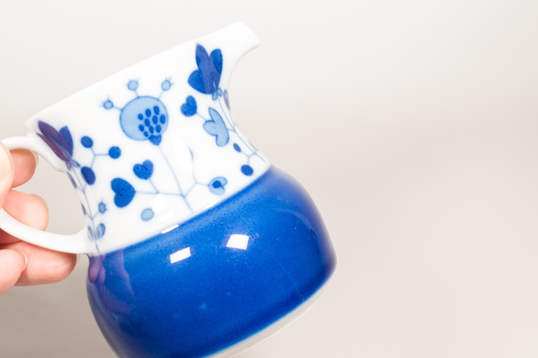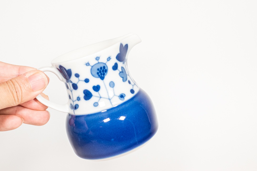 ドイツのThomas-Rosenthal社より、Rotunda(ロタンダ)シリーズのミルクピッチャーが入荷いたしました。1904年に創業したトーマス社は1908年にローゼンタール社に加わりました。絵付けを手掛けたRut Bryk/ルート・ブリュックは、フィンランドの人気女性アーティスト。本作品は夫であるプロダクトデザイン界の巨匠タピオ・ヴィルカラがデザインしたシリーズに、彼女がデコレーションを施したコラボレーションにより生まれました。白地に藍色の花模様が描かれた愛らしい雰囲気の器で、また小ぶりながらも存在感があり、食卓を上品に彩ってくれます。コーヒーや紅茶に添えるミルクピッチャーとしてはもちろん、ソースやドレッシング用の小さなサーバーとしても活躍。Rut Bryk ならではの詩的で温かみのあるデザインを、ぜひお楽しみください。