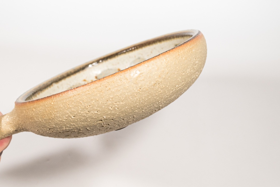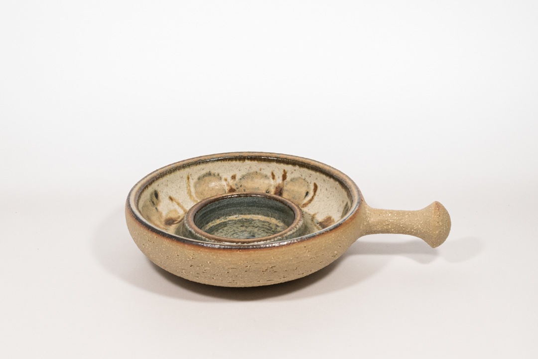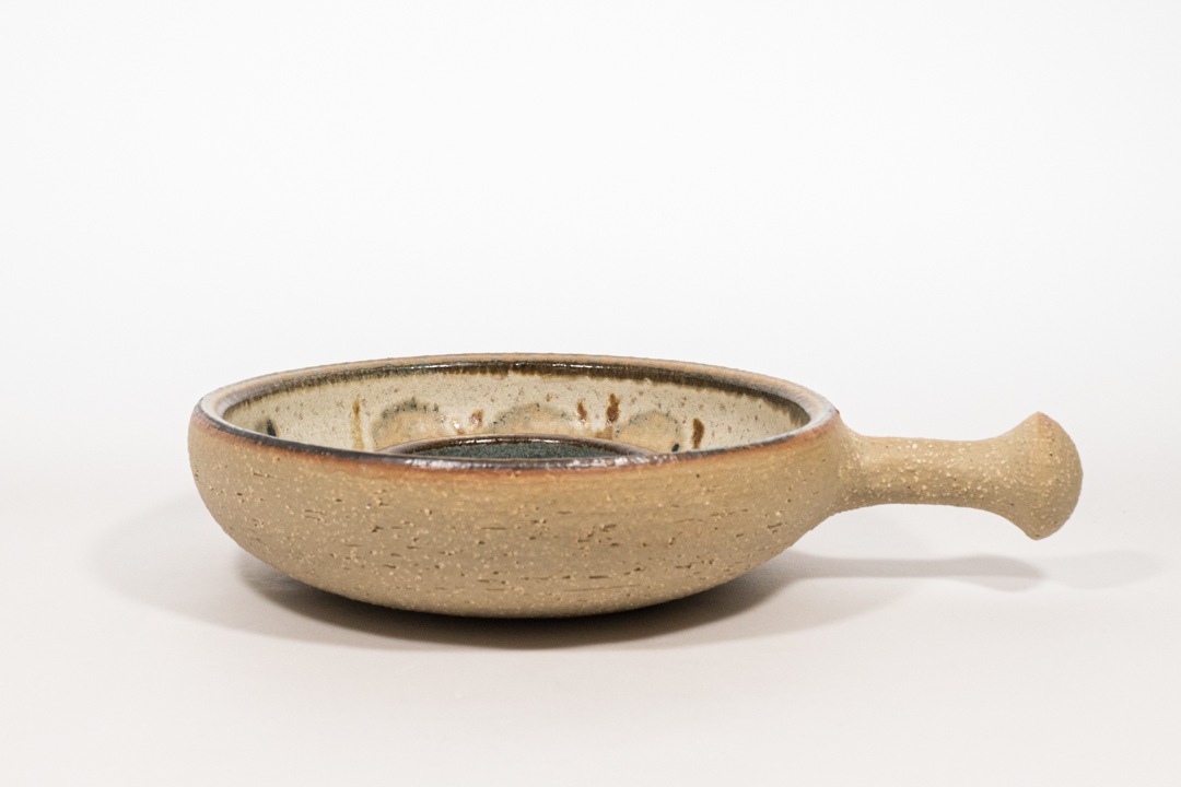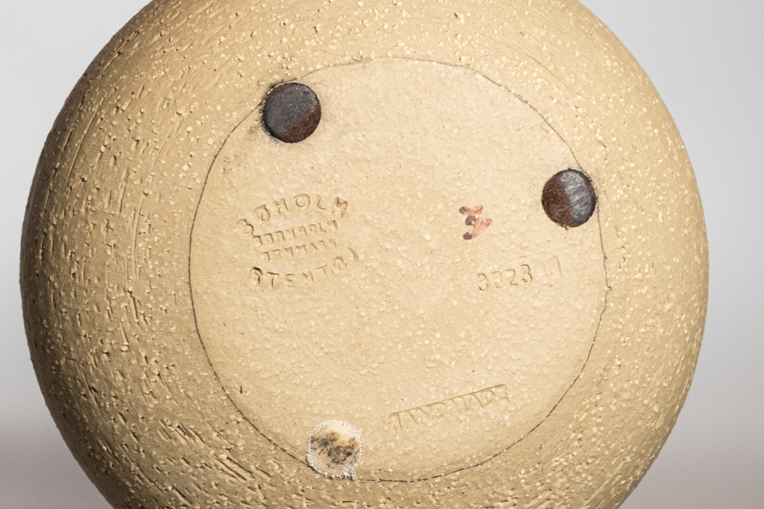 スーホルムは1935にデンマークのボーンホルム島に創業され、閉鎖となった1996年までたくさんの素晴らしい陶芸品を残しました。どこか日本の焼き物にも通ずるような優しい色合いのキャンドルホルダーで、取っ手部分と裏面は釉薬をかけずに土の風合いの残る仕上げとなっています。