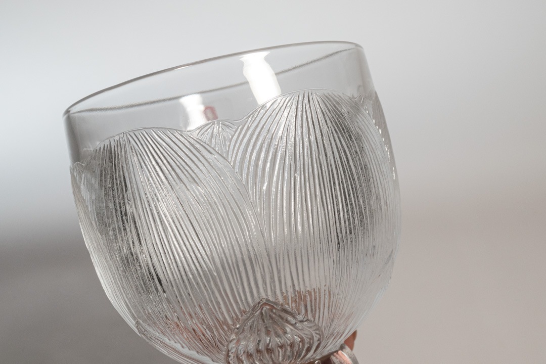 Pioniとは芍薬という意味で、ワイングラスのフォルム全体が一輪の花になっています。縁の厚みや形に揺らぎがあり個体差がありますが、それもまたPioniの特徴のひとつであり、一輪、一輪違う表情を見せる優雅な芍薬の花を連想させてくれます。