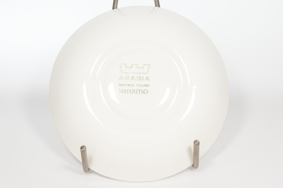 Goran Back/ゴラン・バックデザインのFNモデルのフォルムにEsteri Tomula/エステリ・トムラがデコレーションを担当しています。Vanamoはリンネ草のことで、カップとソーサーにぐるりとリンネ草の葉っぱが描かれゴールドのラインで縁取られています。波打っているフォルムとデコレーションがよく合っていて可憐なイメージを受けます。