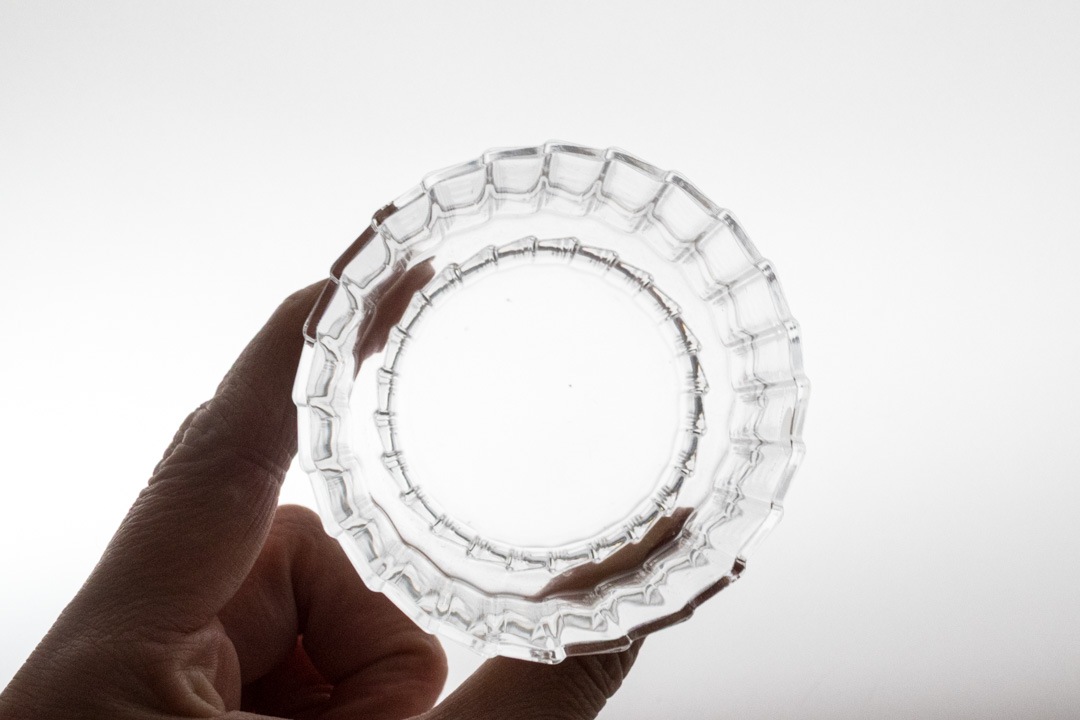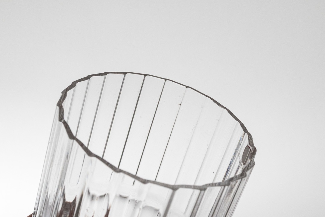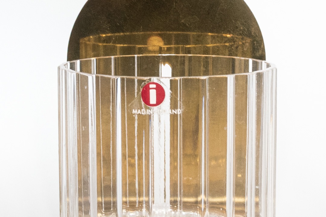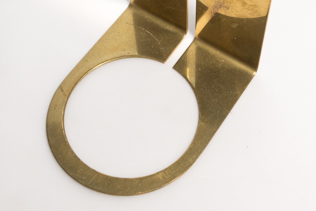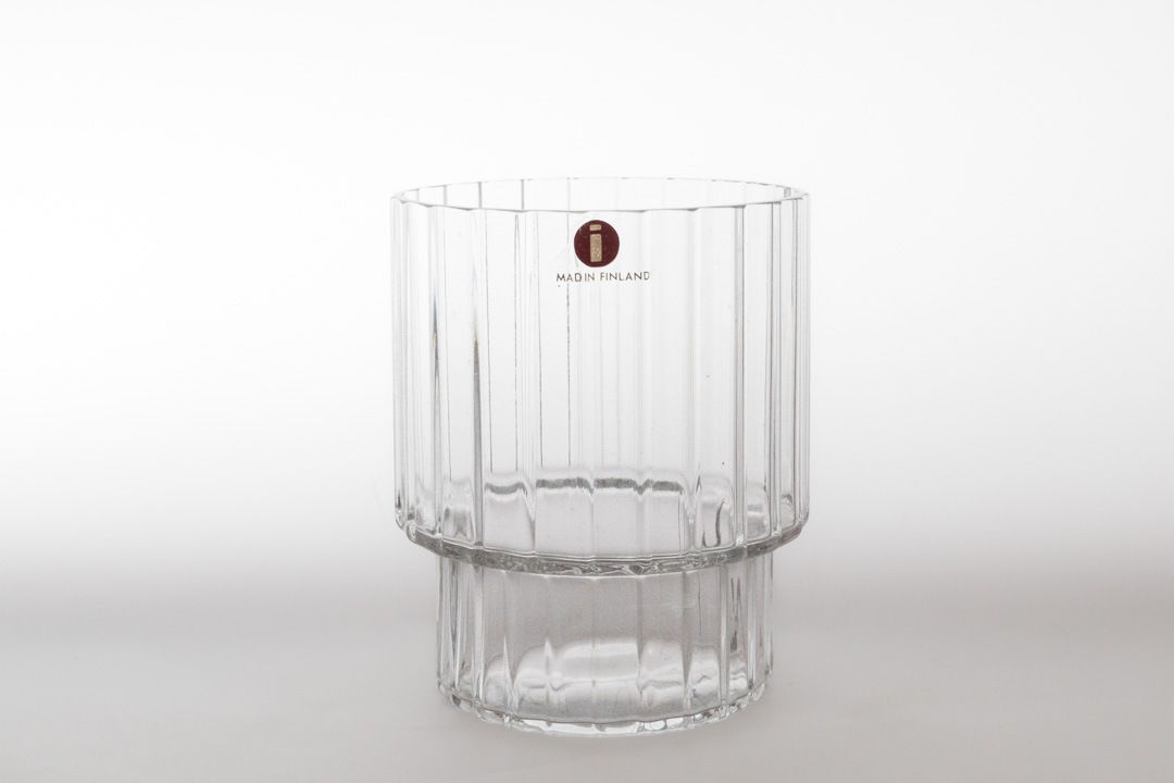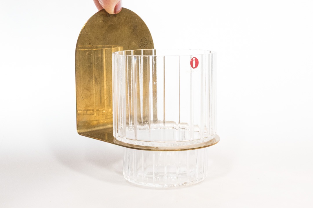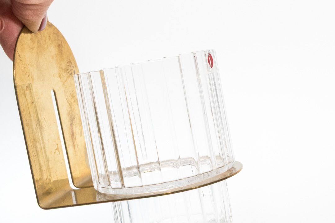 デザインを手掛けたのは様々なガラス製品を生み出したJorma Vennola/ヨルマ・ヴェンノラです。真鍮のベースを壁に固定することで、ブラケット照明のような雰囲気を楽しめるキャンドルホルダーです。TUIKEとは、フィンランド語で「煌めき」の意味を持ちます。真鍮ベースと、多面カットが施されたガラスカップを組み合わせた、雰囲気のあるヴィンテージピースです。直線的なカット面がキャンドルの光を美しく反射し、壁面に柔らかな陰影を描きます。経年変化によって深みを増した真鍮の色合いや、細かな擦れ、小傷はヴィンテージならではの魅力。現行品にはない静かな存在感が、空間に落ち着きと奥行きを与えます。状態としましては真鍮ベースの経年変化やガラスの微細キズなど薄っすら見られる箇所はありますが、美観を損ねる程度ではないと思います。