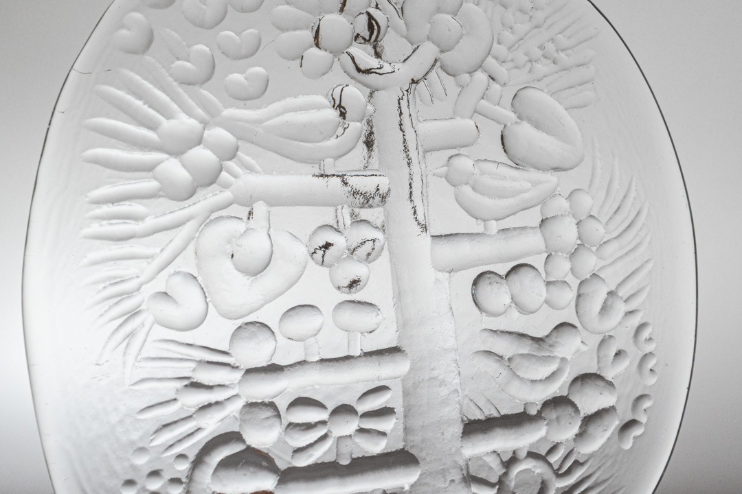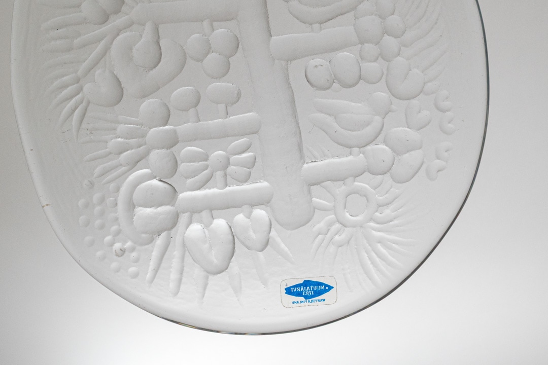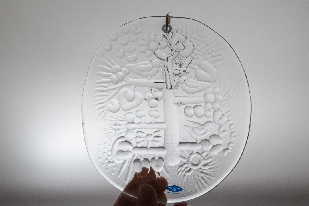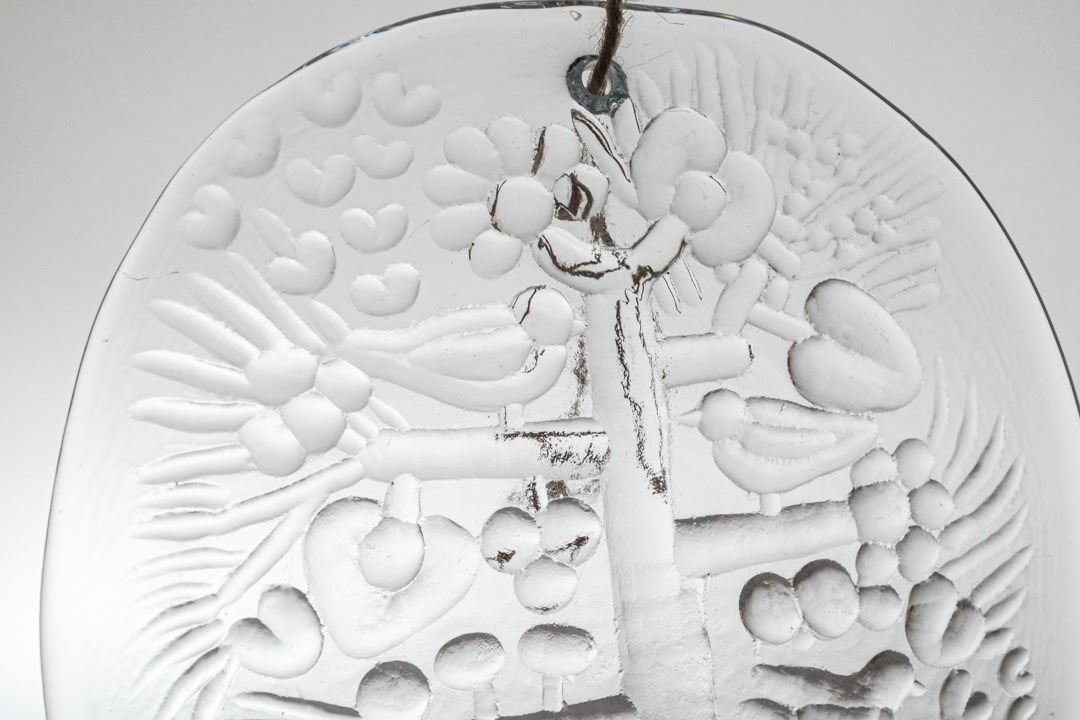 デザインはKerttu Nurminen/ケルットゥ・ヌルミネンによるものです。木に小鳥がとまっている様子がとても可愛いらしいです。繊細なテクスチャーが、光を受けて美しく輝きます。壁にかけたり、窓辺に飾ったりと、お部屋のアクセントとしてもおすすめです。