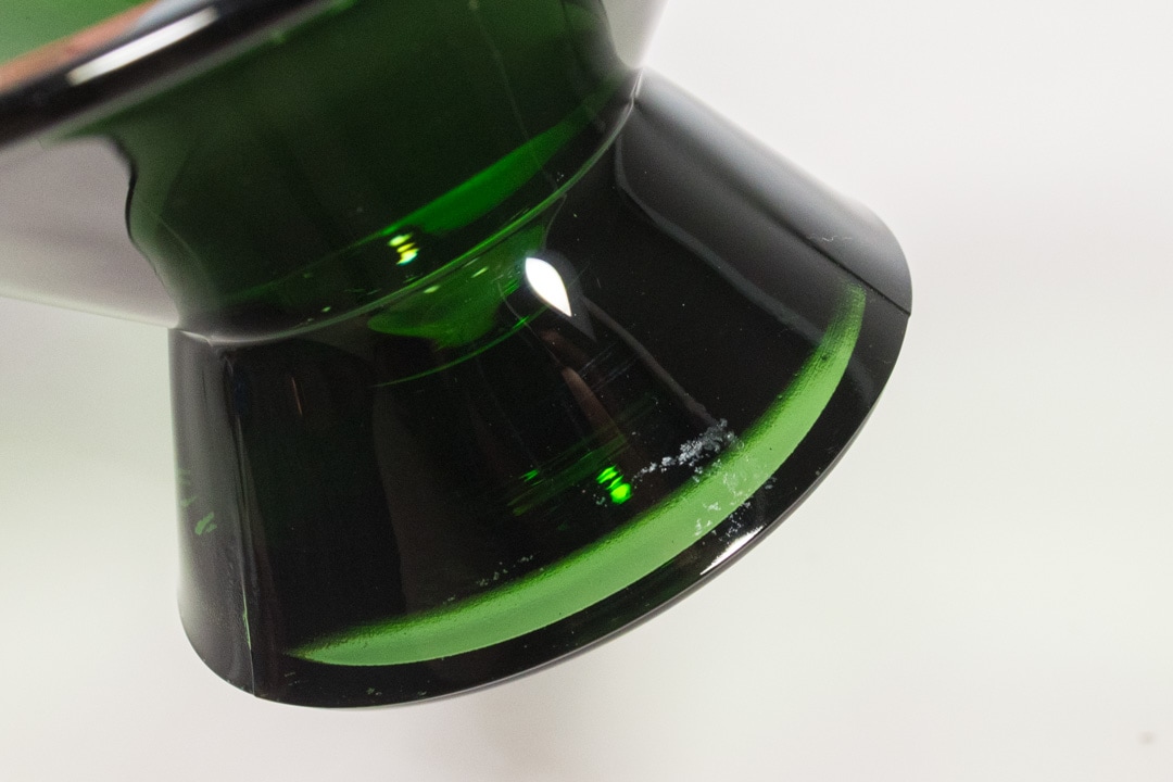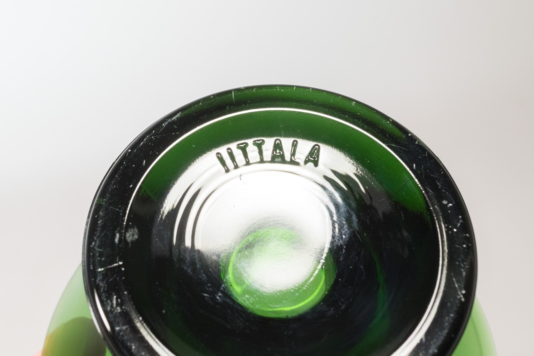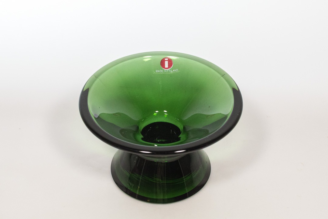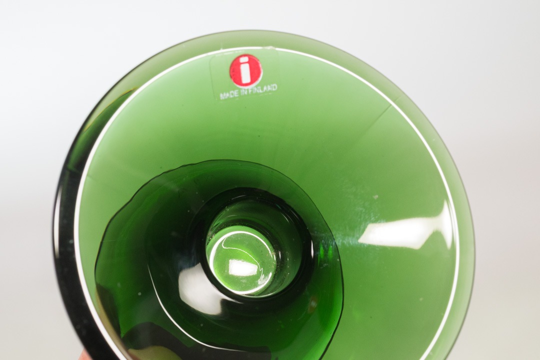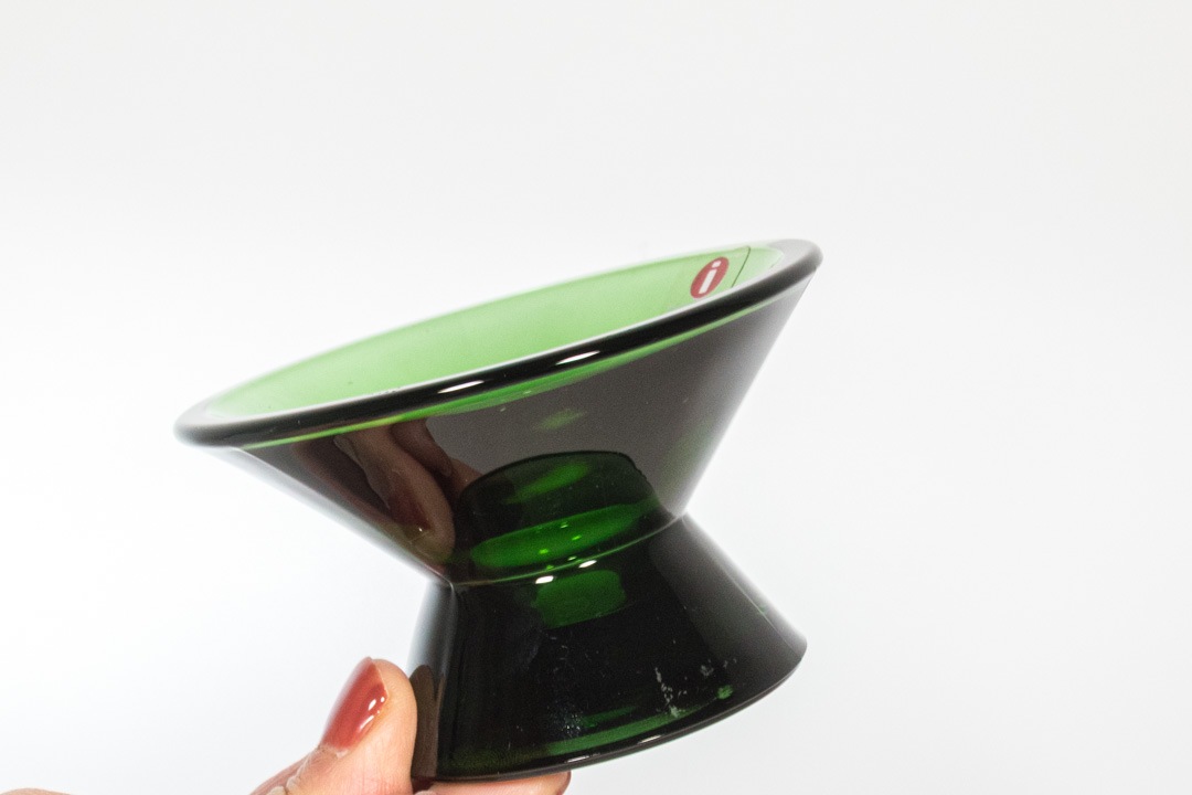 フィンランドデザインの巨匠、Kaj Franck/カイ・フランクによるデザインです。現在もタンブラーが作られ続けているKartio、円錐という意味そのままの形が特徴的ですが、こちらのキャンドルホルダーは円錐が2つ繋がったような形をしています。Kartioキャンドルホルダーは当初Nuutajarvi社で1956年〜1971年に作られておりました。iittalaになった後の1995年に復刻し、現在は再び廃盤となっています。ステッカーは横長のもので復刻されてから初期段階で製造されたものだと思われます。