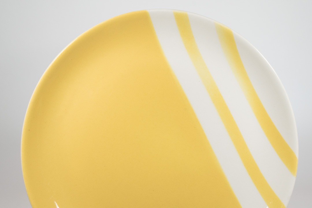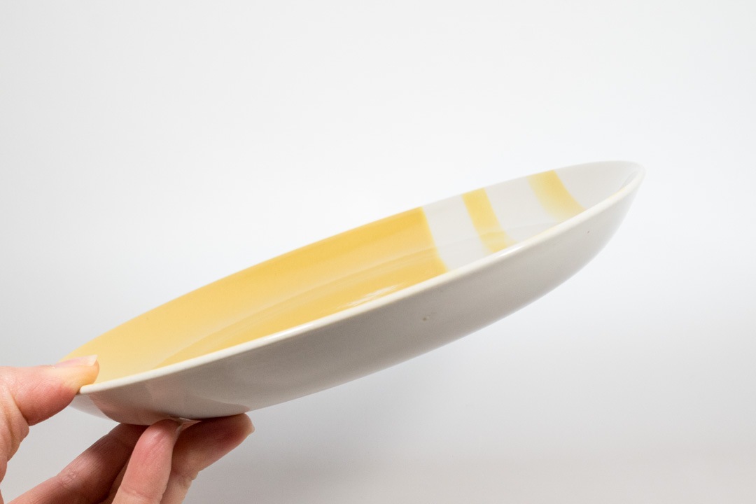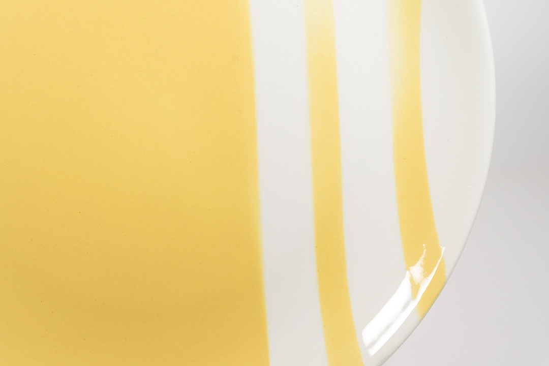 淡いイエローに白の3本ラインの組合せが印象的です。縁に丸みのあるフォルムでかわいらしく、使いやすさも備わったデザインだと思います。