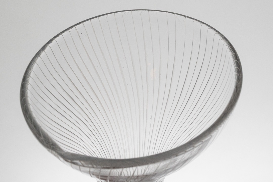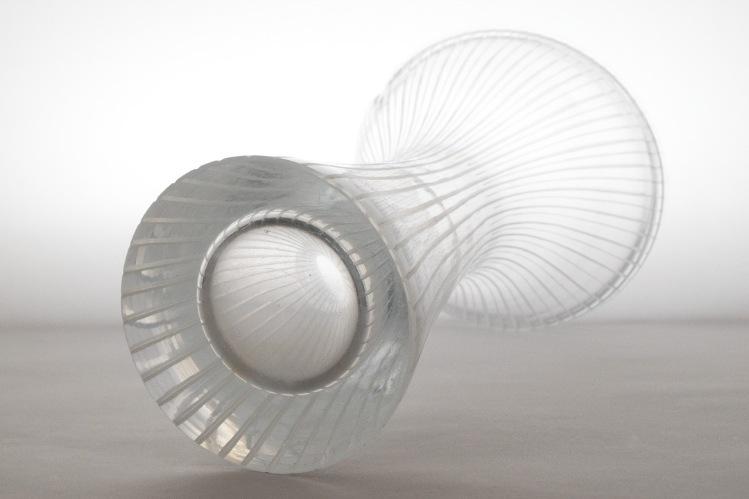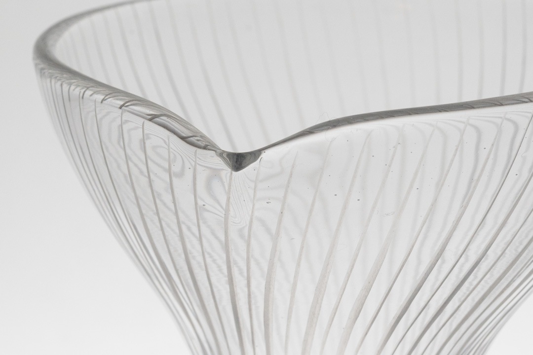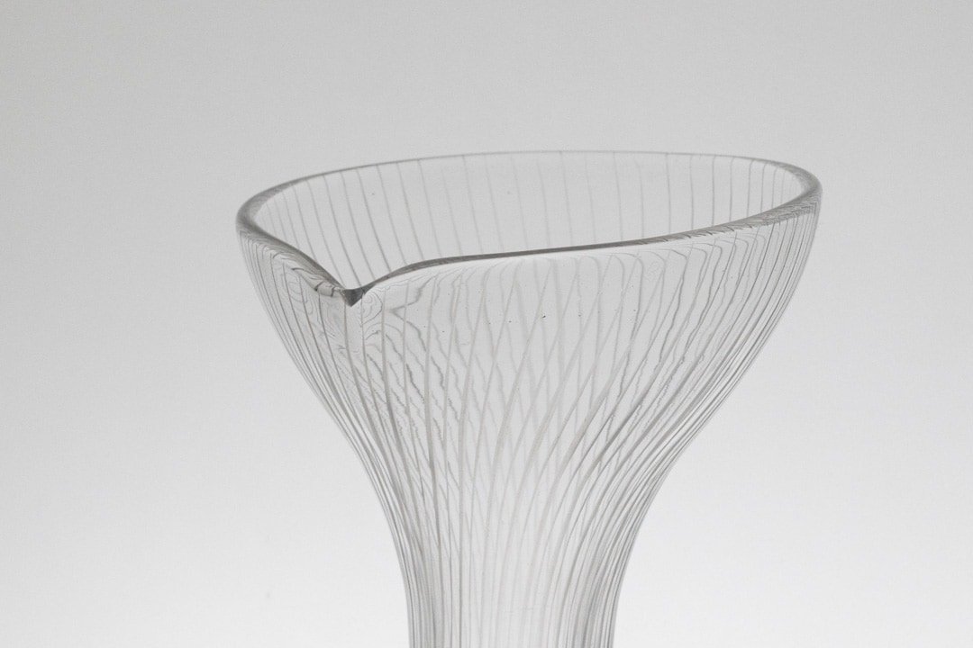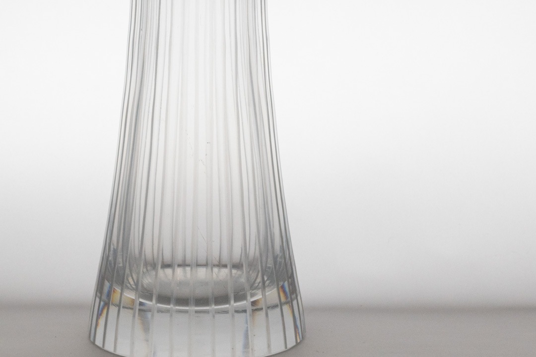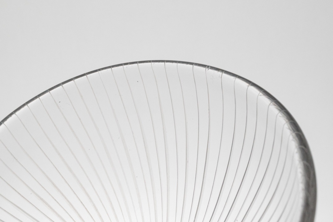 「Kantarelli(カンタレリ)」はフィンランド語で“アンズタケ(きのこ)”を意味し、自然界から着想を得た有機的なフォルムが特徴です。縦に流れる繊細なリブ模様と、上部に向かって優雅に広がるシルエットは、まるで森の中に自生する植物のような生命感を感じさせます。透明感のあるガラスは光を美しく取り込み、置く場所や角度によって表情を変え、空間に静かな存在感をもたらします。