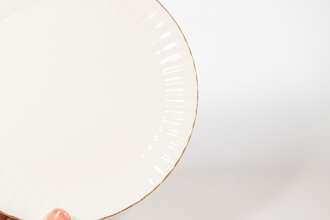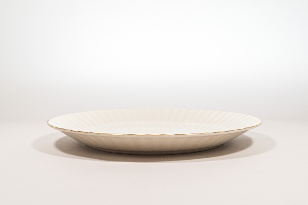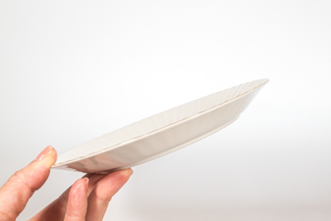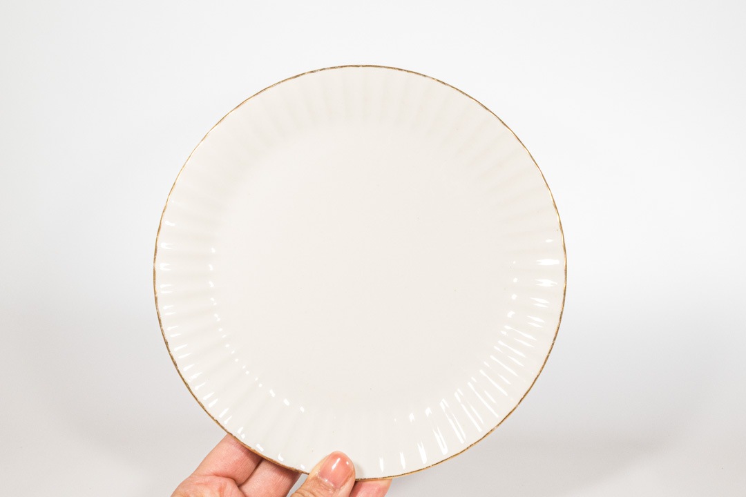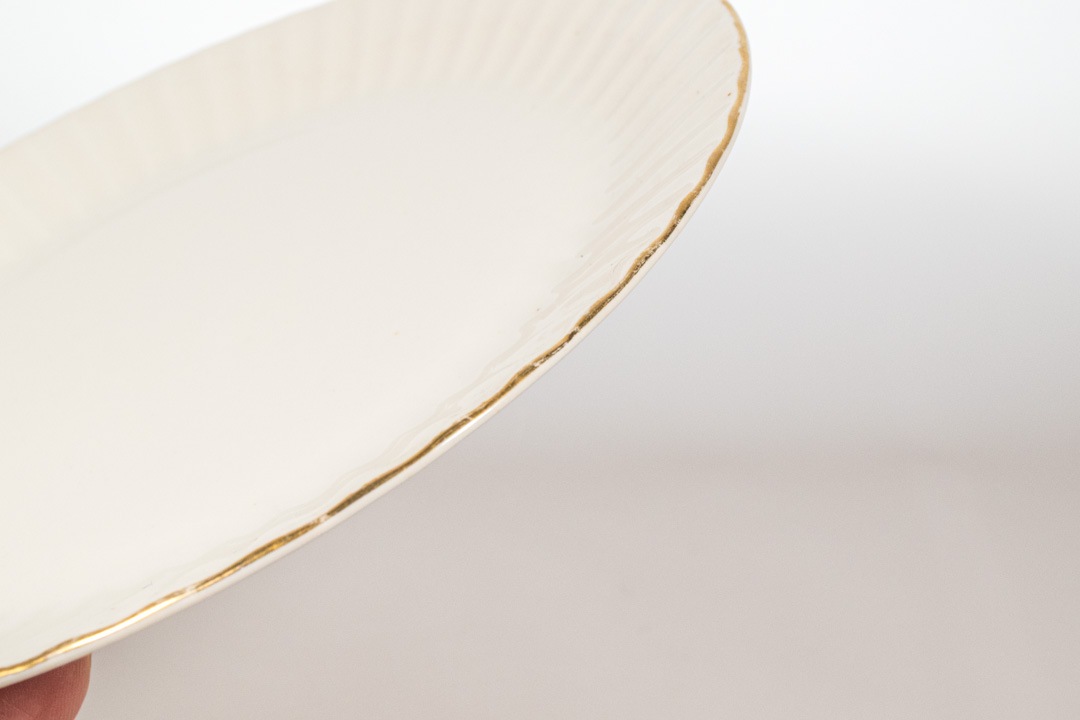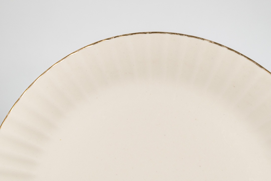 デザインはカイ・フランクです。クルタピースクとはフィンランド語でキク科のアキノキリンソウを意味します。縁のエンボスラインがとても美しく、上から見るとお花のように見えます。ゴールドの縁取りのカラーリングも上品なアクセントになっています。こちらは直径が約17cmなのでデザートや取り分けの皿にちょうど良いサイズです。
