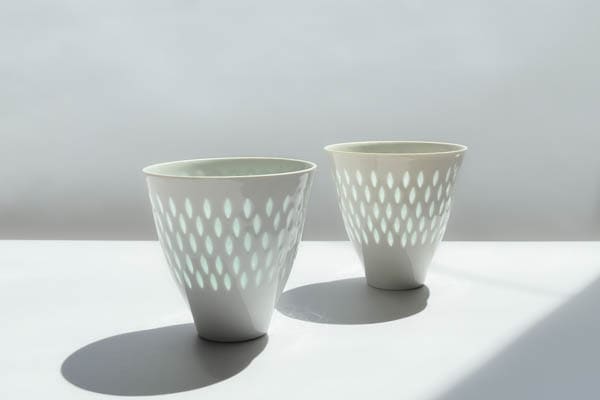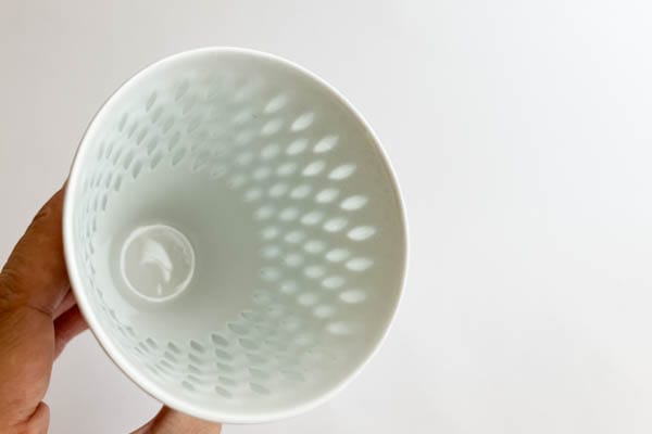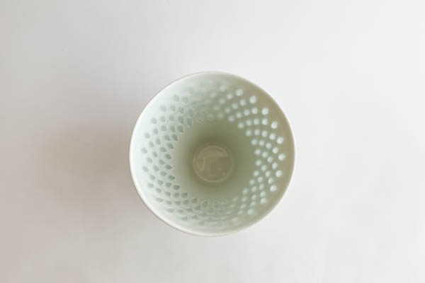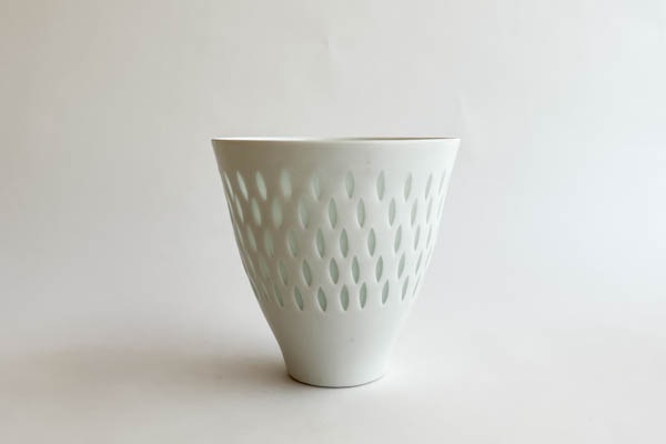 アラビア社で長く活躍し、アートデパートメントのディレクターを務めた時期もありました。このシリーズは中国磁器の蛍手(ほたるで)というの伝統技法を用い、10年もの歳月をかけて考案されたそうです。細身のフォルムがライスポーセリンシリーズの繊細な美しさをさらに引きだしているカップです。