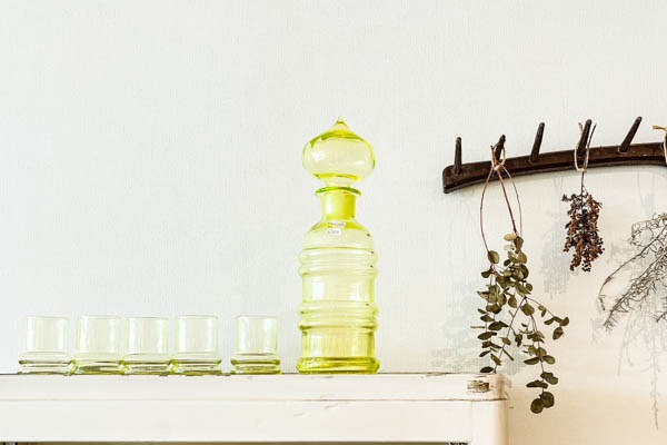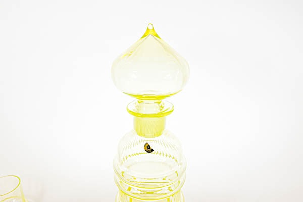 ナニースティルは1950 年代後半より大胆でカラフルな作品を作るようになりました。このシリーズのインスピレーションは、1960 年代初頭のイスタンブールへの旅行だったそうです。デキャンタの上部にはしっかりとしたオニオンドームストッパーが印象的です。