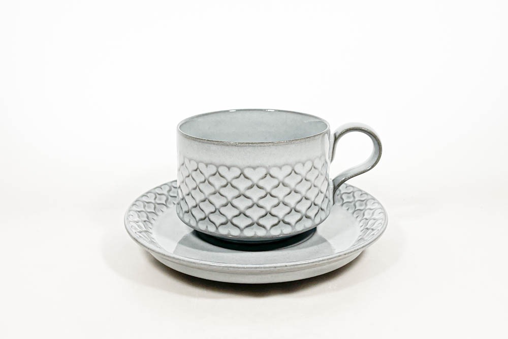 B&G社よりCordial/コーディアルシリーズのカップ&ソーサーが入荷しました。デンマークを代表するデザイナーの一人であるJens.H.Quistgaard/イェンス.H.クイストゴーのデザインです。デンマーク語で「心からの・まごころ」という意味で、パターン化されたハート模様がそれを表しているようです。ハートのモチーフですが、色の濃い素地にライトグレーの釉薬がハートの模様を浮かび上がらせるデザインは、可愛くなりすぎない落ち着いた雰囲気を感じます。