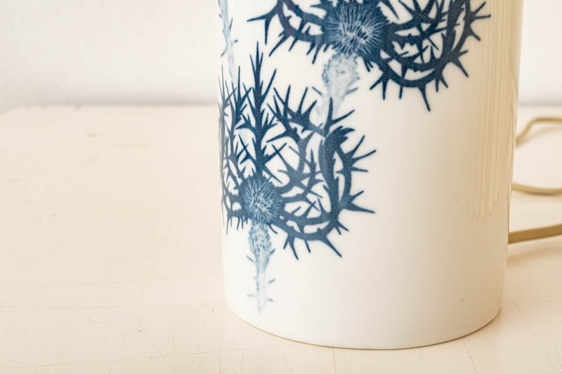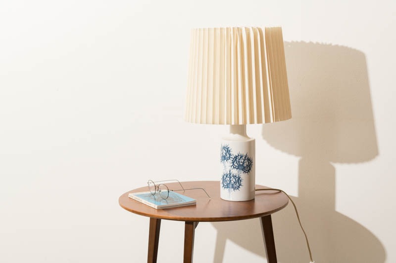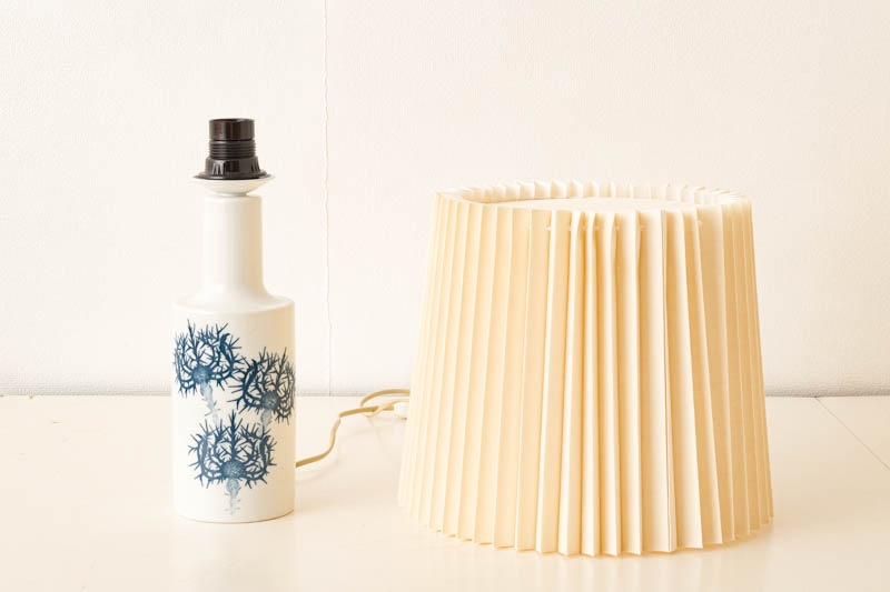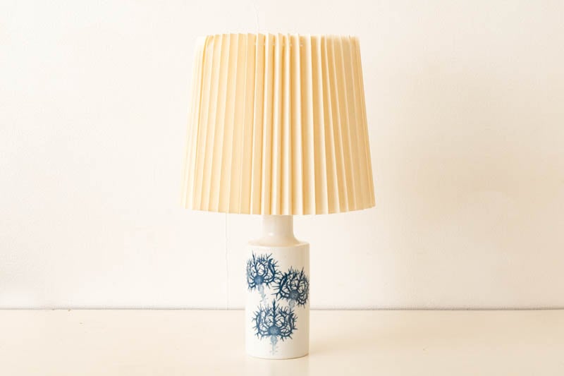 Royal Copenhagen・Fog og Morup社製、Kai Langeデザインのテーブルランプが入荷しました。ベースはROYALシリーズです。シンプルな円柱状の真っ白い陶器に、深いブルーカラーで”アザミ”の花が描かれており、清潔感のある印象です。デンマークから直接取り寄せた新品のシェードを合わせ、柔らかい光で落ち着いた空間を演出いたします。