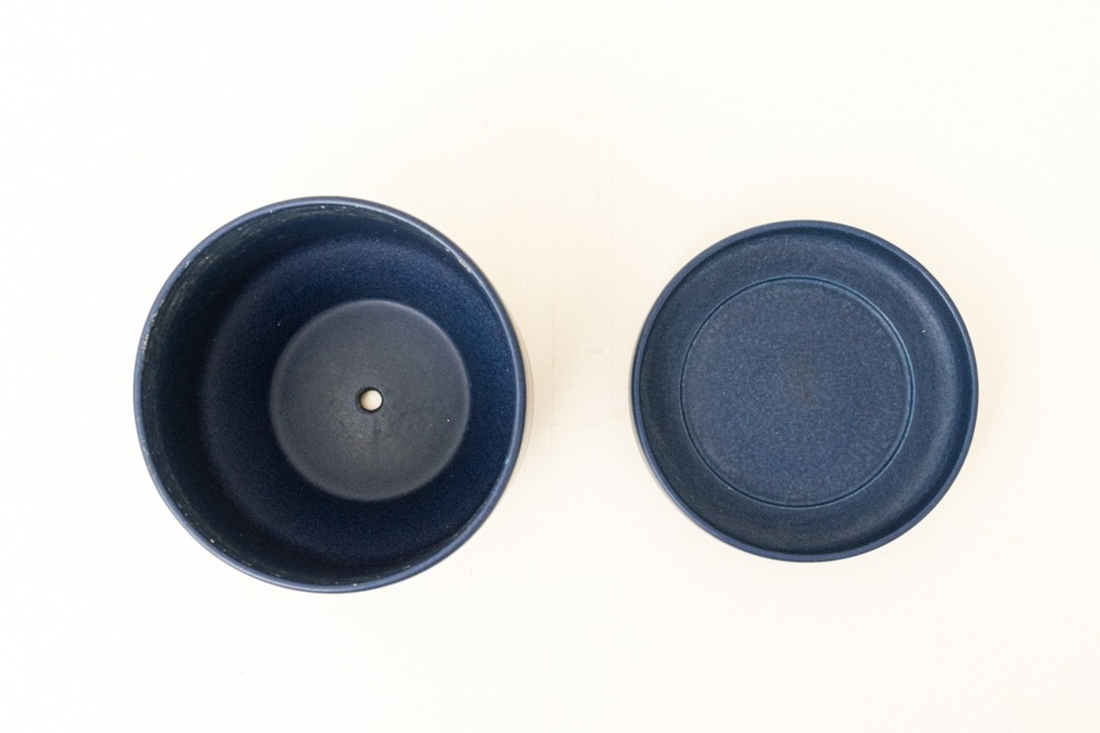 屋外で使用されることが多いフラワーポットですので、使用感やポットの内側を中心に汚れがございますが、年代相応のもので極端に印象を損ねるものではないと思います。こちらのブルーのフラワーポットは現地でもあまり見かけない珍しいカラーです。