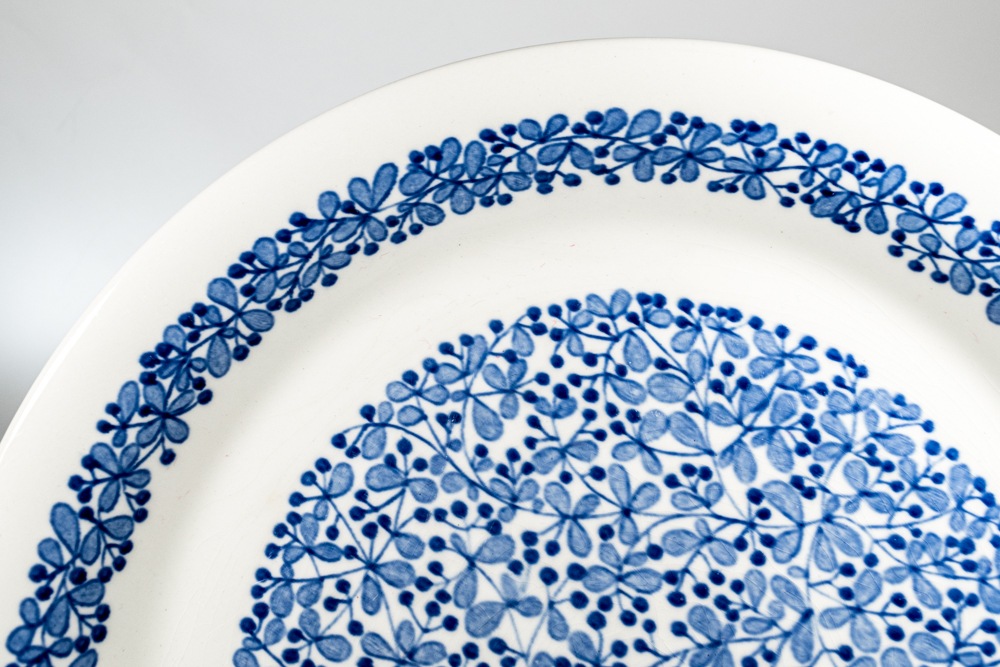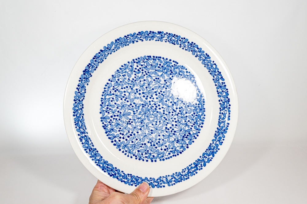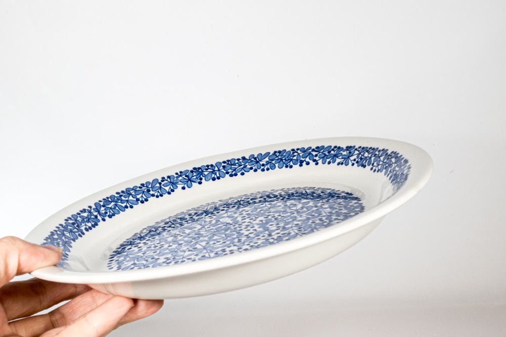 デザイナーは不明ですが市場でもあまり見かけることのない珍しいアイテムだと思います。プレートいっぱいに広がるブルーベリーの絵柄がとても可愛いらしいです。