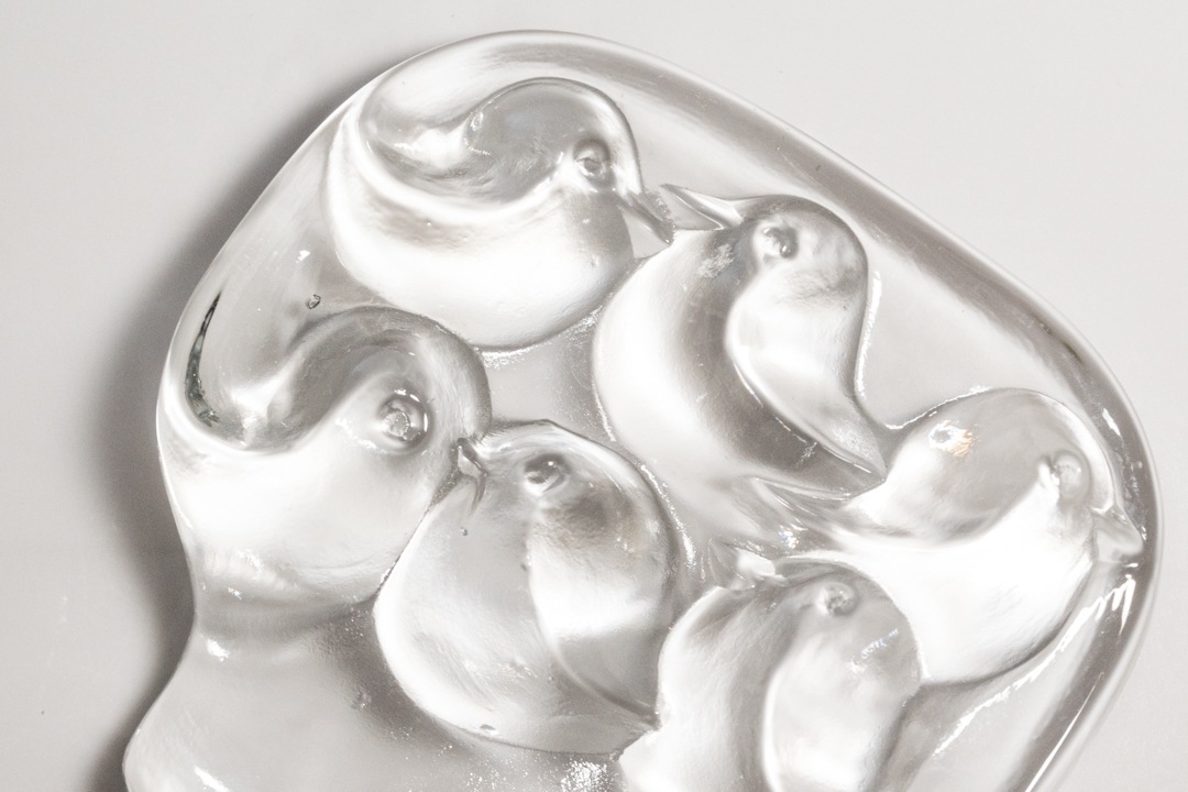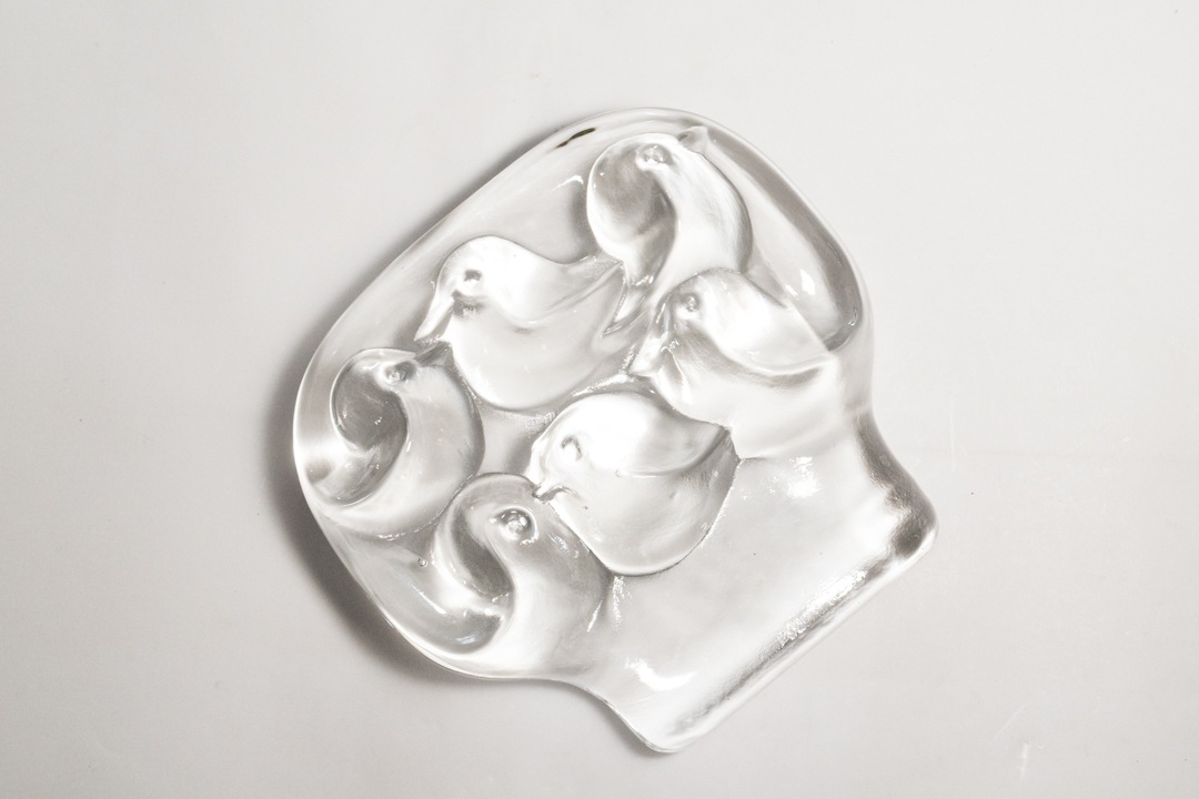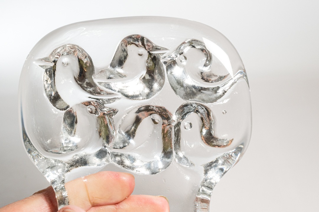 6羽の鳥が木にとまっている様子が象られていてとても可愛いらしいです。デザインを手掛けたのは様々なガラス製品を生み出したJorma Vennola/ヨルマ・ヴェンノラ。こちらは1970年代の終盤~80年代初期頃までの数年の間に 彼によって手掛けられたガラス細工で、彼の “Kuusi”(クーシ)などのシリーズが有名ですが、動物モチーフも得意とするデザイナーでもあり、動物たちの特徴を捉えた可愛らしい作品たちは独特な表情を放ってくれます。分厚いガラスなのでペーパーウェイトとしても使えそうです。