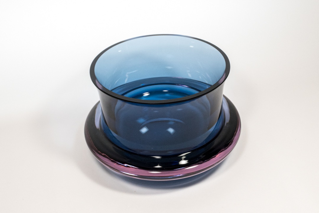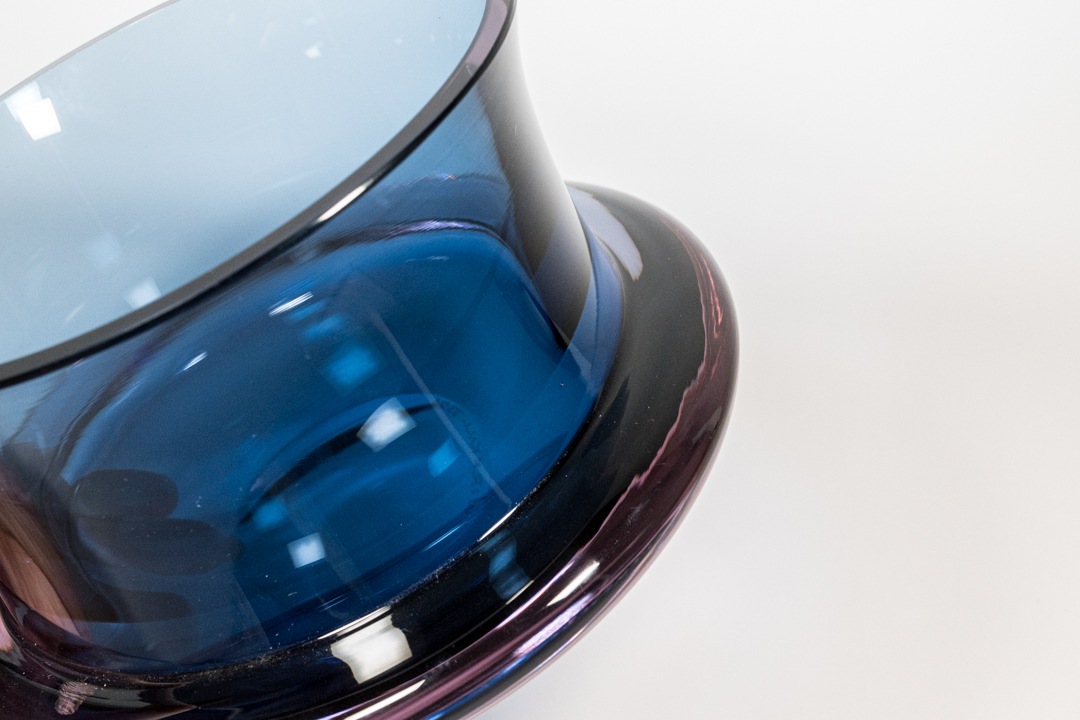 Tapio Wirkkalaはフィンランドを代表するデザインナーのひとりであり、雄大な自然からインスピレーションを受け、多くの名作を世に生み出したことで知られています。こちらはブルーとアメジストカラーのグラデーションが涼やかな印象で、光を透すとガラスの色彩が織りなす表情が現れ美しさとを増します。底面には「TAPIO WIRKKALA 3321」としっかり刻まれ、コレクターズアイテムとしても人気のある作品です。