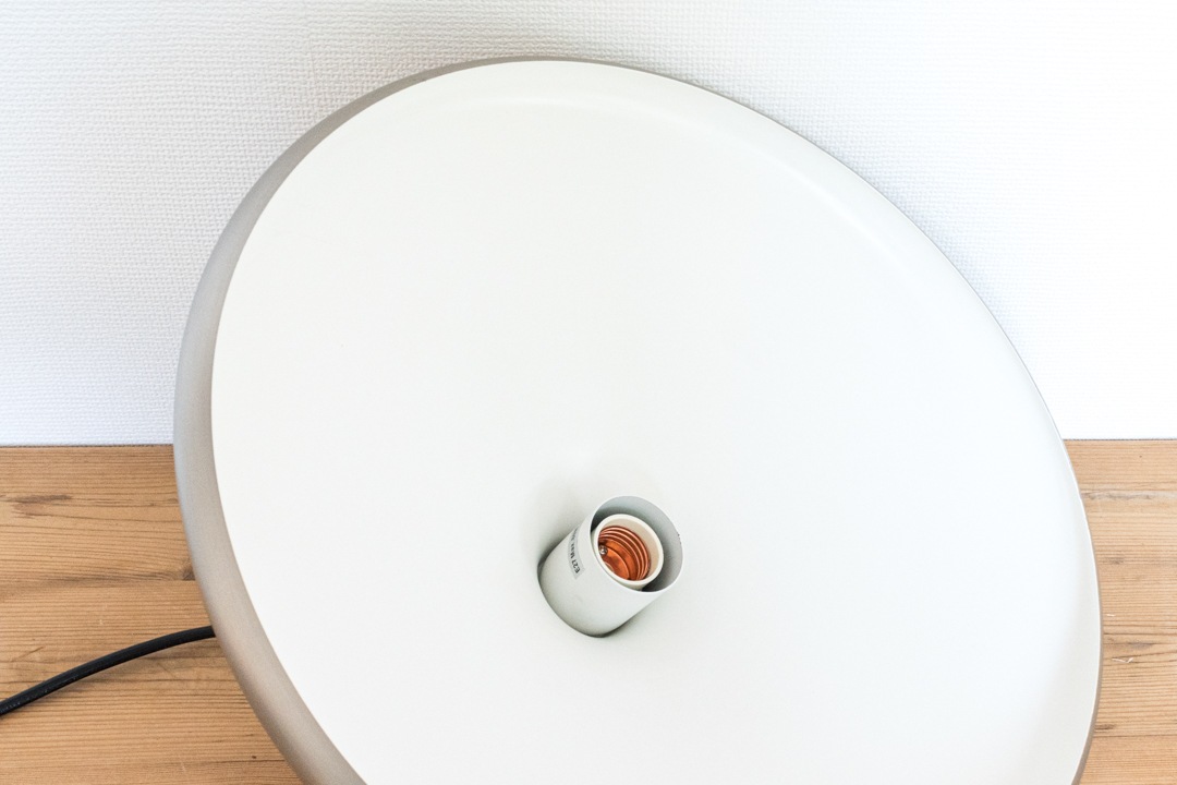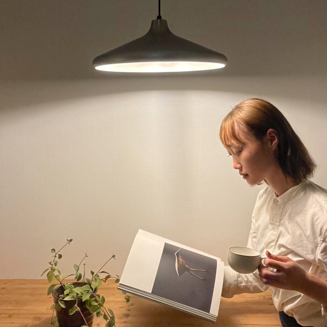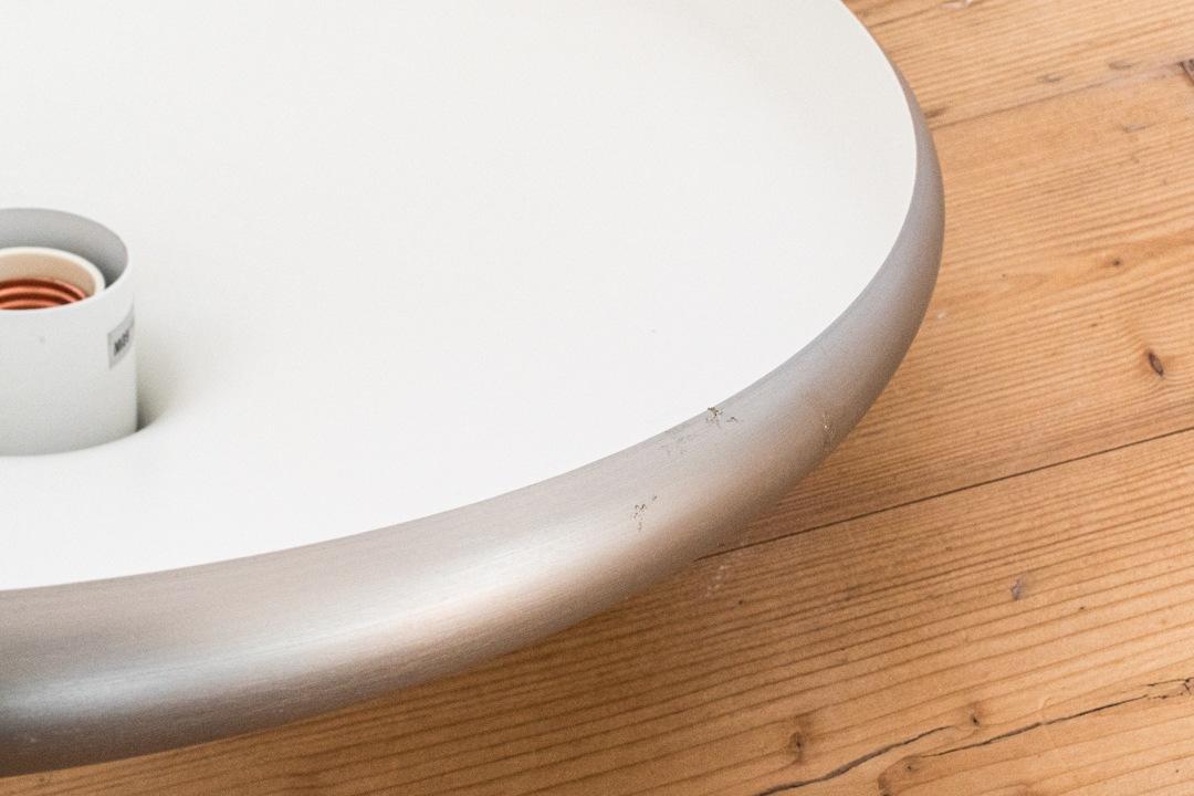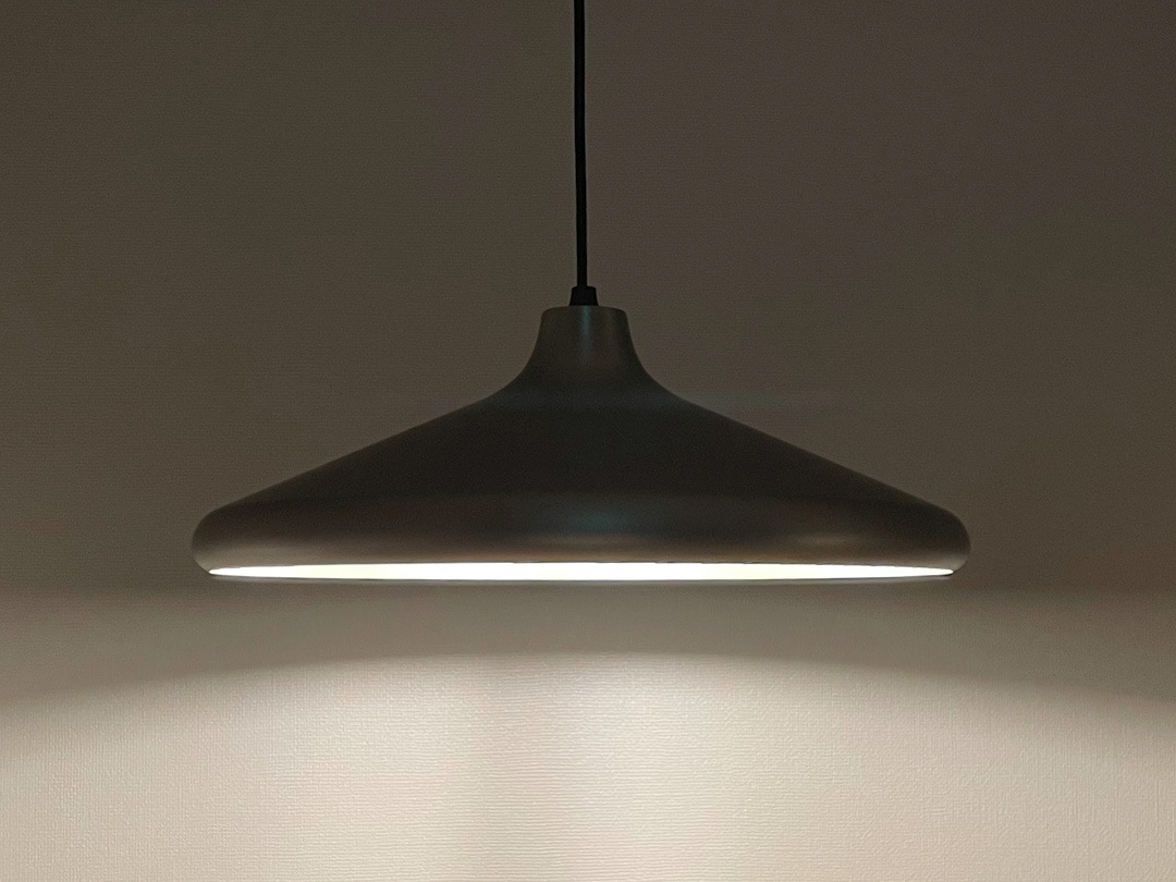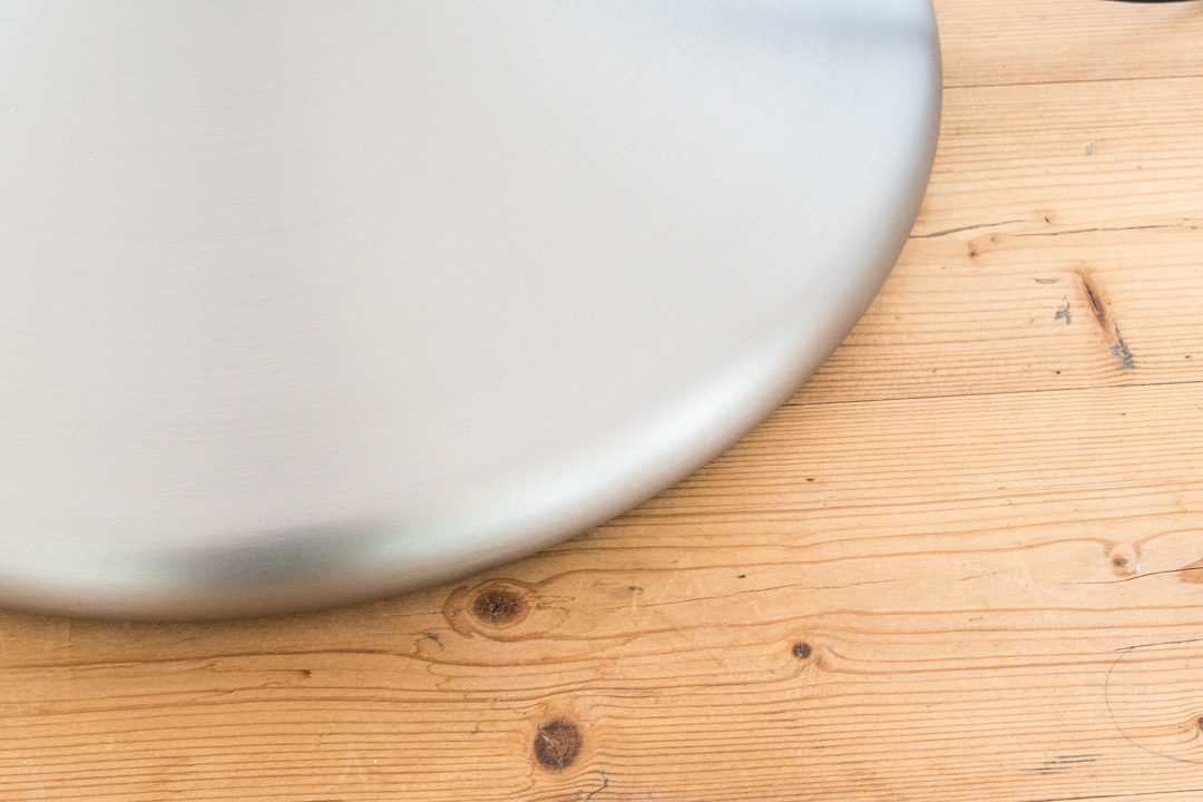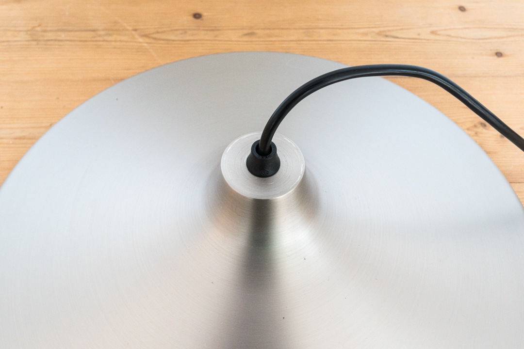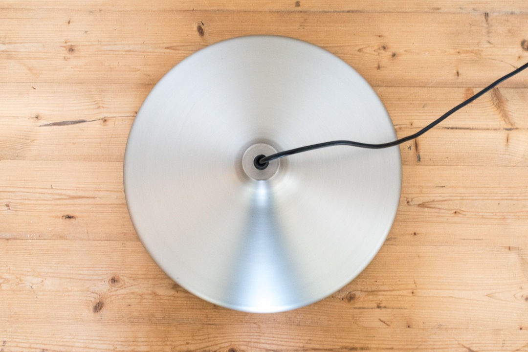 シルバーのヘアライン仕上げされたシンプルながら洗練されたフォルムが美しく、空間の主役になるような印象を受けます。広いシェードはダイニングやリビングに十分な光を確保しつつ、空間にすてきなアクセントを添えてくれます。 引っ掛けシーリングとコードは新品のものに交換いたしますので、到着後すぐにお使い頂けます。