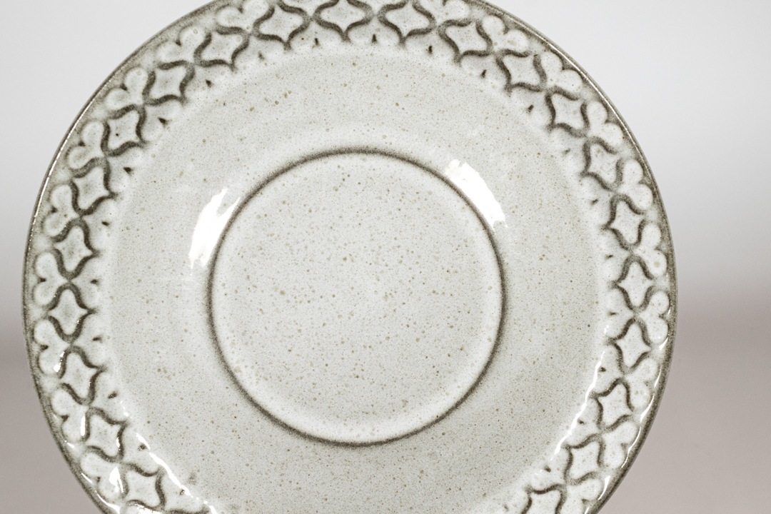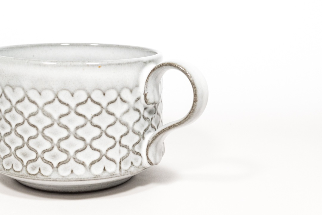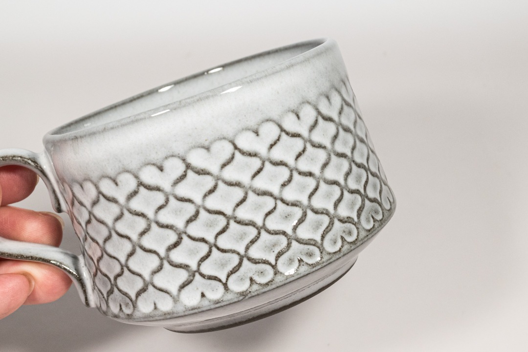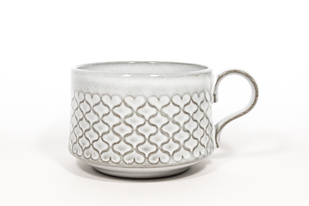 B&G社よりCordial/コーディアルシリーズのカップ&ソーサーが入荷しました。デンマークを代表するデザイナーの一人であるJens.H.Quistgaard/イェンス.H.クイストゴーのデザインです。デンマーク語で「心からの・まごころ」という意味で、パターン化されたハート模様がそれを表しているようです。ハートのモチーフですが、色の濃い素地にライトグレーの釉薬がハートの模様を浮かび上がらせるデザインは、可愛くなりすぎない落ち着いた雰囲気を感じます。